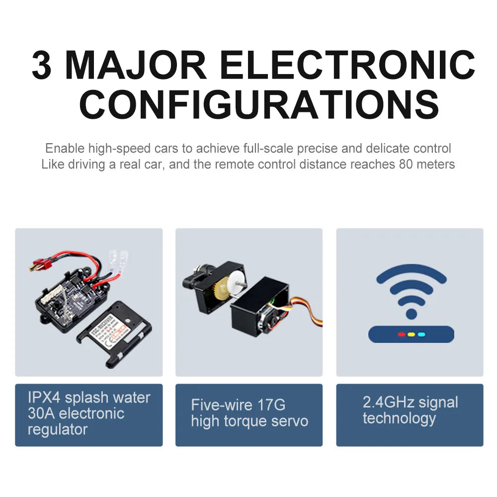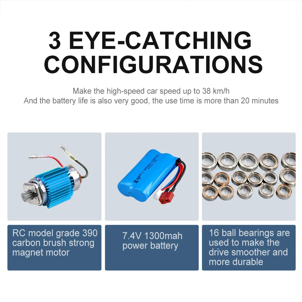 【Speedy Drift】: Powered by RC390 strong power motor and Designed with a unique front and rear gear planetary differential, the racing car toy can drift and reach up to a speed of 50km/h, providing you a thrilling drift experience.