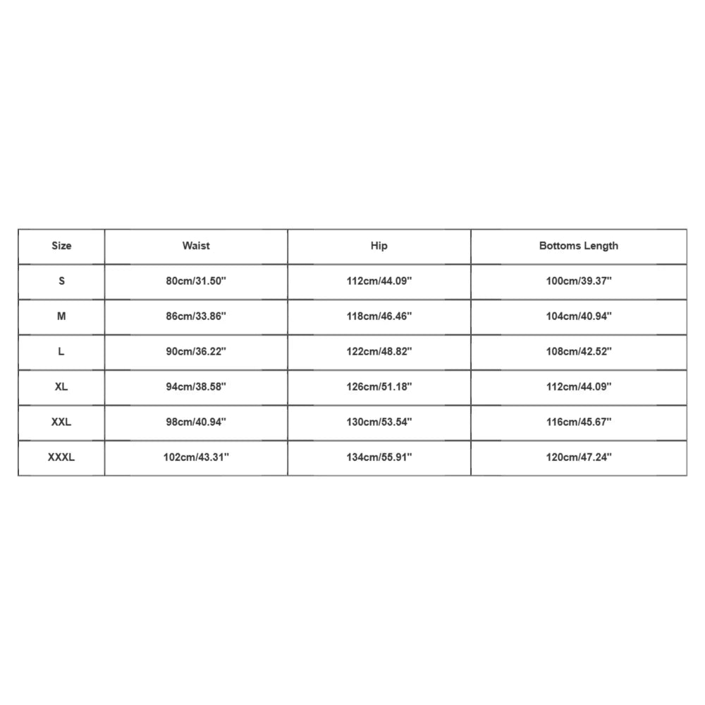 | Size:XXXL | Waist:102cm/43.31'' | Hip:134cm/55.91'' | Bottoms Length:120cm/47.24'' |
