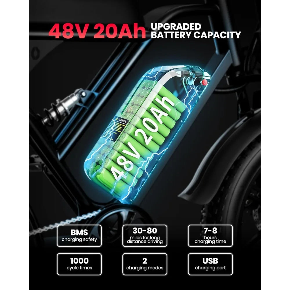 - 【48V 20AH Battery】Our e-bike is equipped with a detachable 48V 20AH battery, providing an impressive range of 30-70 miles on a single charge. No more worries about running out of juice during your explorations. And with a quick 7-8 hours recharge time, you'll be back on the road in no time.