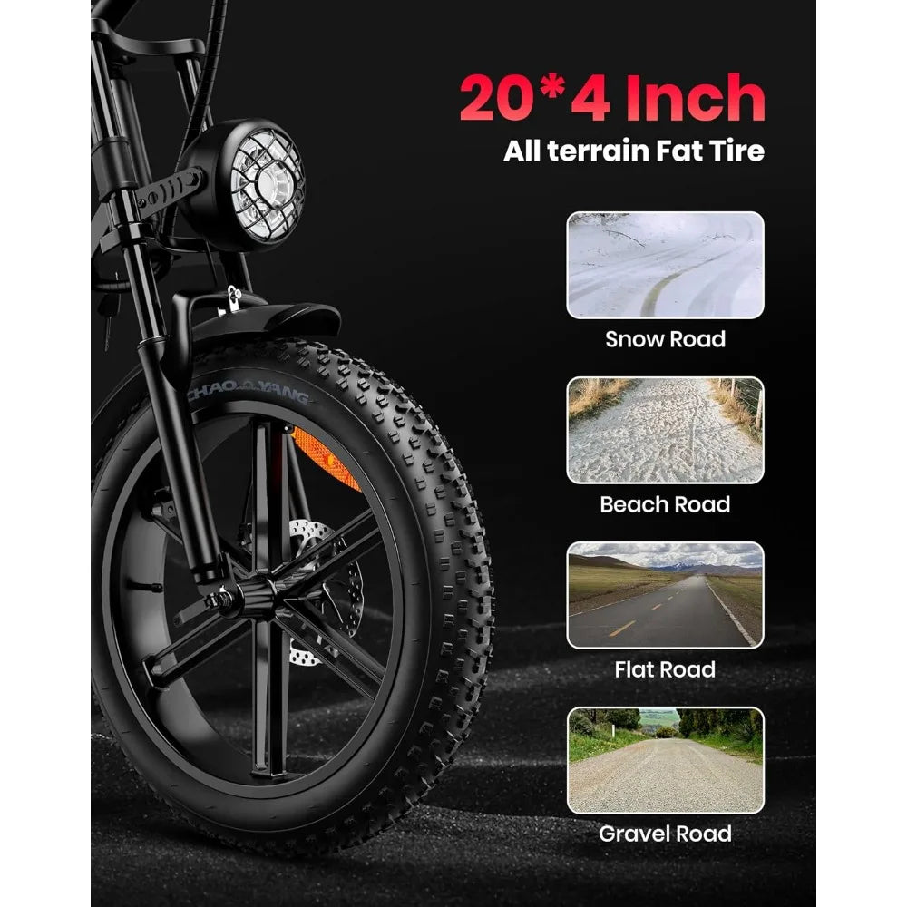 - 【20"&4" Fat Tire】Confront any surface with confidence thanks to the 4-inch fat tires that offer unparalleled stability and traction. Whether it's cruising along sandy beaches, navigating rocky trails, or conquering urban streets, our electric bike is ready to tackle any challenge that comes your way.
