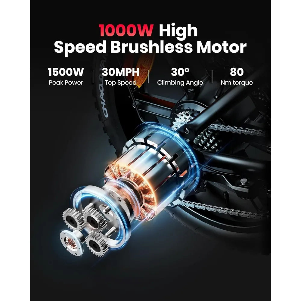 - 【Peak 1500W Brushless Motor】 Experience the exhilaration of our electric bike designed for adults, featuring a robust 1000W motor with a peak output of 1500W. Feel the wind in your hair as you effortlessly reach speeds up to 32MPH, making every ride an adventure of adrenaline and freedom.