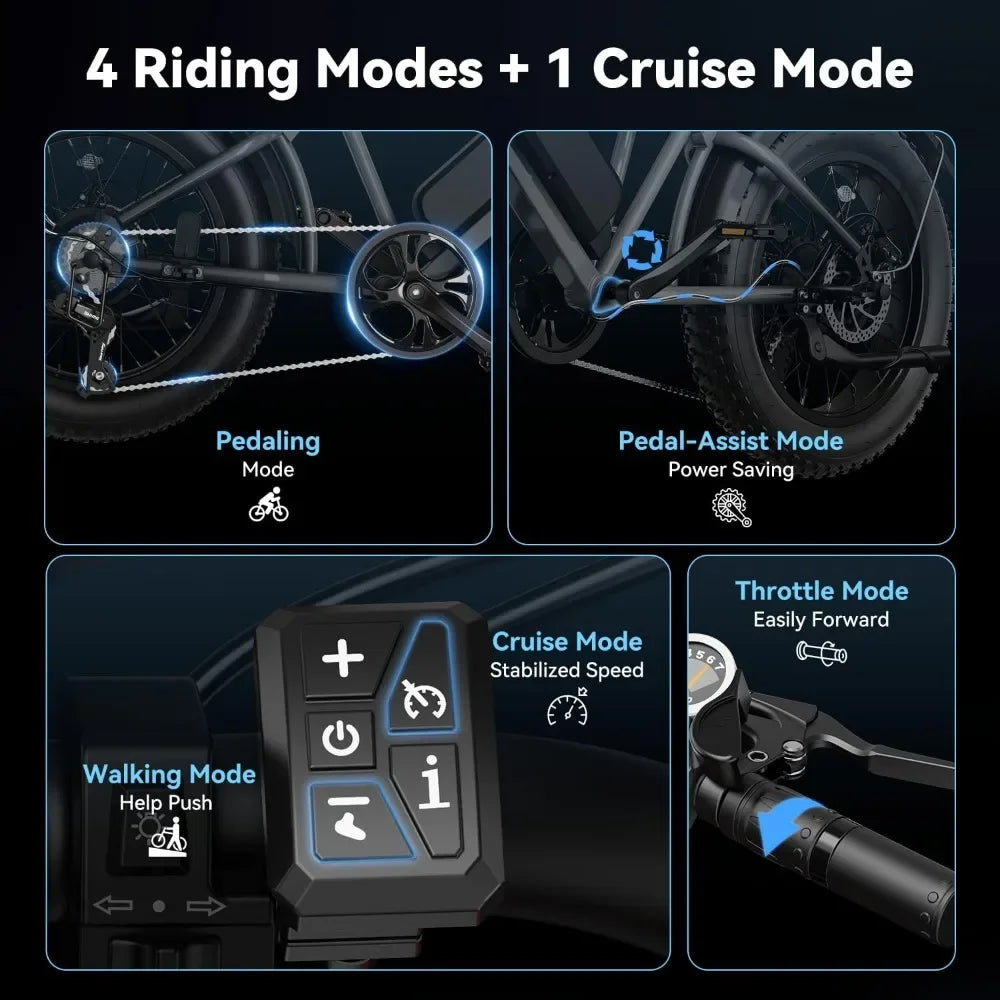 [Powerful Brushless Motor & 30MPH Max Speed]- ebikes for adults is equipped with a 750W high-speed brushless motor(peak 1500W), 99Nm maximum torque, and up to 30MPH speeds, making steep hills and long rides a breeze. 7-speed transmission and 4 cycling modes: pure electric, electric assist, pure pedal, and cruise Mode. With 20 x 4-inch fat tires, it can traverse including mountains, snow, beaches, rocky roads, and even urban jungles.
