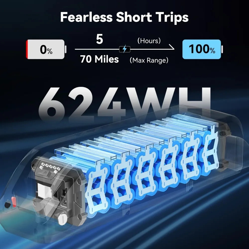 [Carefree Travel]- The 48V/13AH removable battery with IPX6 waterproof offers up to 70 miles of travel (PAS mode) on a single charge (4 hours). Moreover, smart BMS ensures battery safety and power saving; while the fast-charging design ensures quick and easy charging, improving convenience in daily use.
