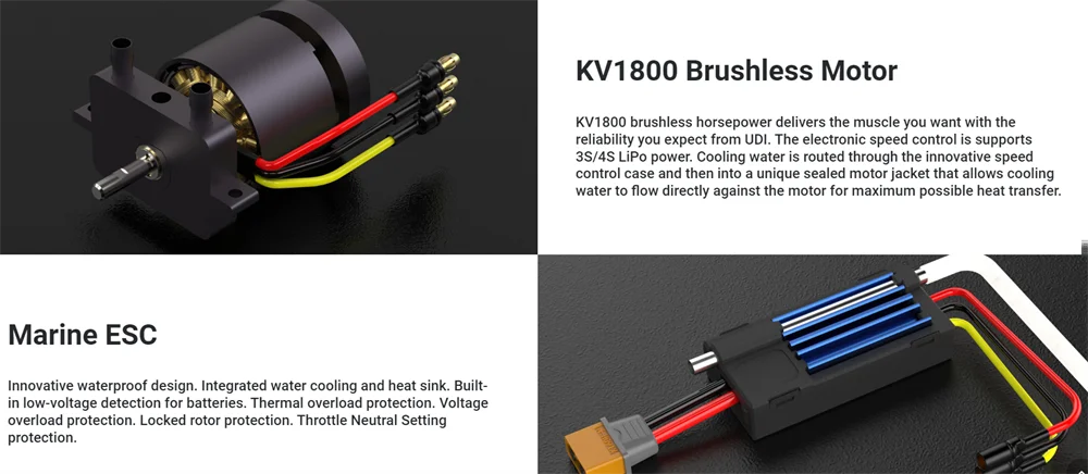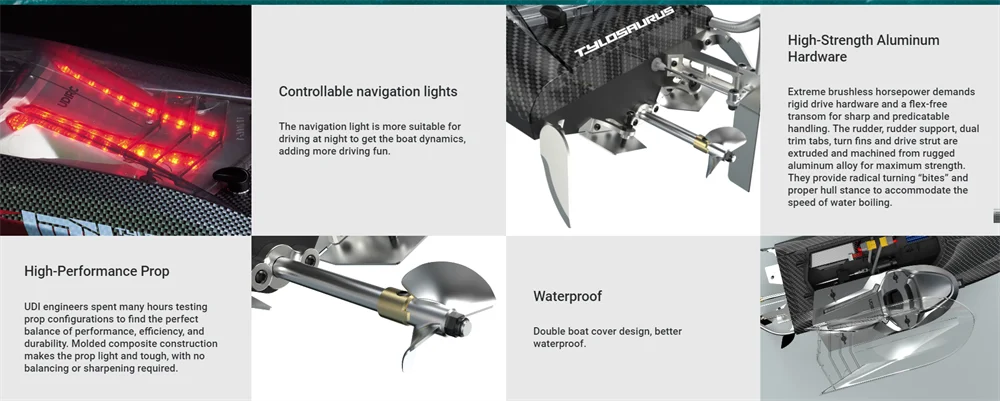 Go forward and backward. Turn left and right. Capsize, over-distance alarm prompt, low-voltage alarm and speed-down prompt,water cooling system, double-layer cabin cover design, 3 lighting modes