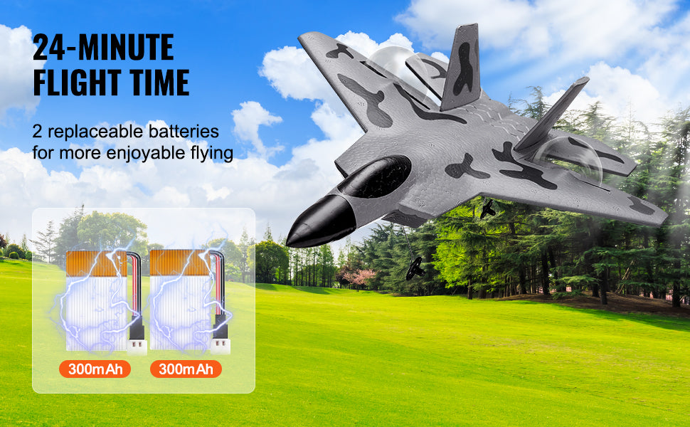 Extended Flight Time: This remote control plane includes two sets of 300mAh batteries, providing up to 24 minutes of flight time. Simply replace the depleted battery with the second set for uninterrupted flying fun—no more waiting around for recharges.