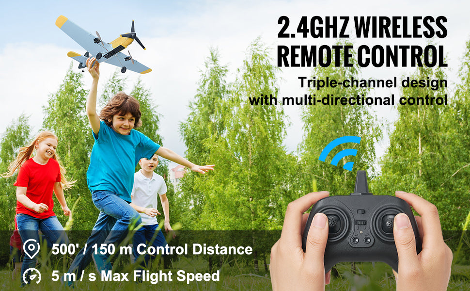 2.4 GHz Wireless Control System: Take full control with the easy-to-use remote. Fly up, down, left, right, forward, and backward with a range of up to 500'/150 m. The 2.4 GHz frequency ensures a reliable connection, allowing multiple remote control airplanes to fly together hassle-free—ideal for friendly competitions! The low battery warning will notify you upon return or landing to prevent unnecessary battery depletion during the flight.