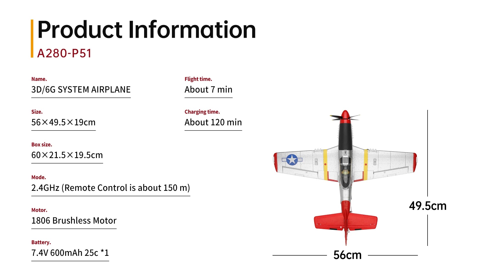 XK-A280 World War II fighter P51 high simulation aircraft, it adopts 6-axis gyroscope,attitude locking, 3D/6G mode conversion, suitable for different scenarios, more suitable for beginners to advance and practice flying. Air mode conversion, more beginner mode and aerobatic mode.