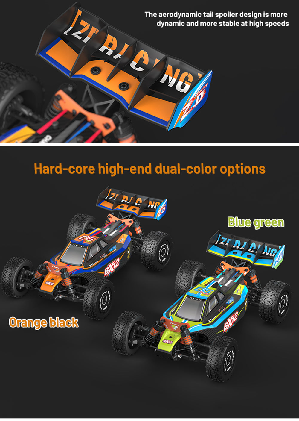 3. Configuration of narrow front and wide rear all-terrain race tires, equipped with spoiler tail, more smooth speed.